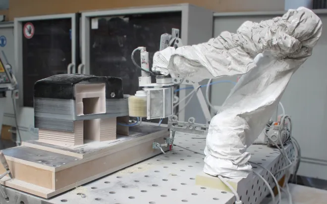 Wir verwenden Ihn als Schleifroboter, welcher unsere Bauteile direkt nach dem Fräsen rundum schleift und das Teil auf den nächsten Schritt vorbereitet.